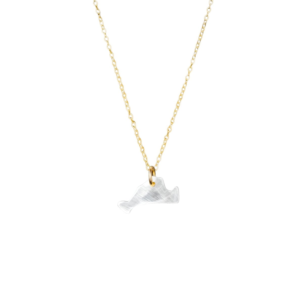 Celebrate your love for the island with this elegant keepsake. A luminous piece of mother of pearl is carved into the shape of Martha’s Vineyard and suspended from a delicate 18" satellite chain. The iridescent shell catches the light beautifully, adding a subtle shimmer to your neckline.