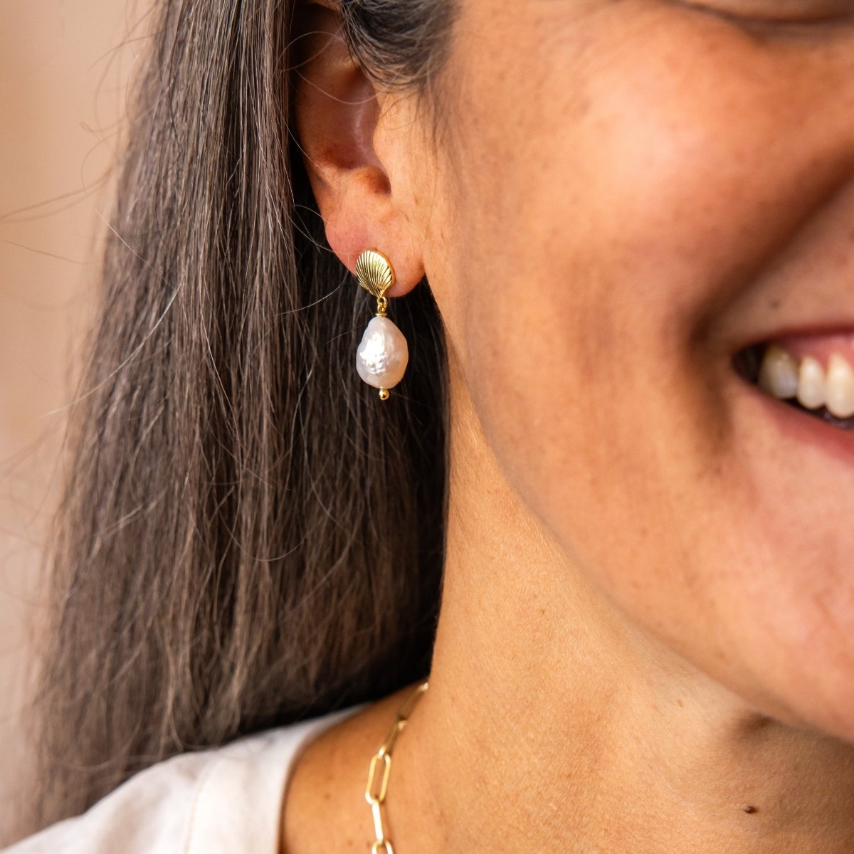Ocean lovers - these scallop shell drop earrings are for you! Simple and sweet, these sea shell earrings feature a lustrous white pearl that’s perfect for your coastal summer wardrobe. From beach to brunch, these earrings will add a touch of coastal charm to your look.