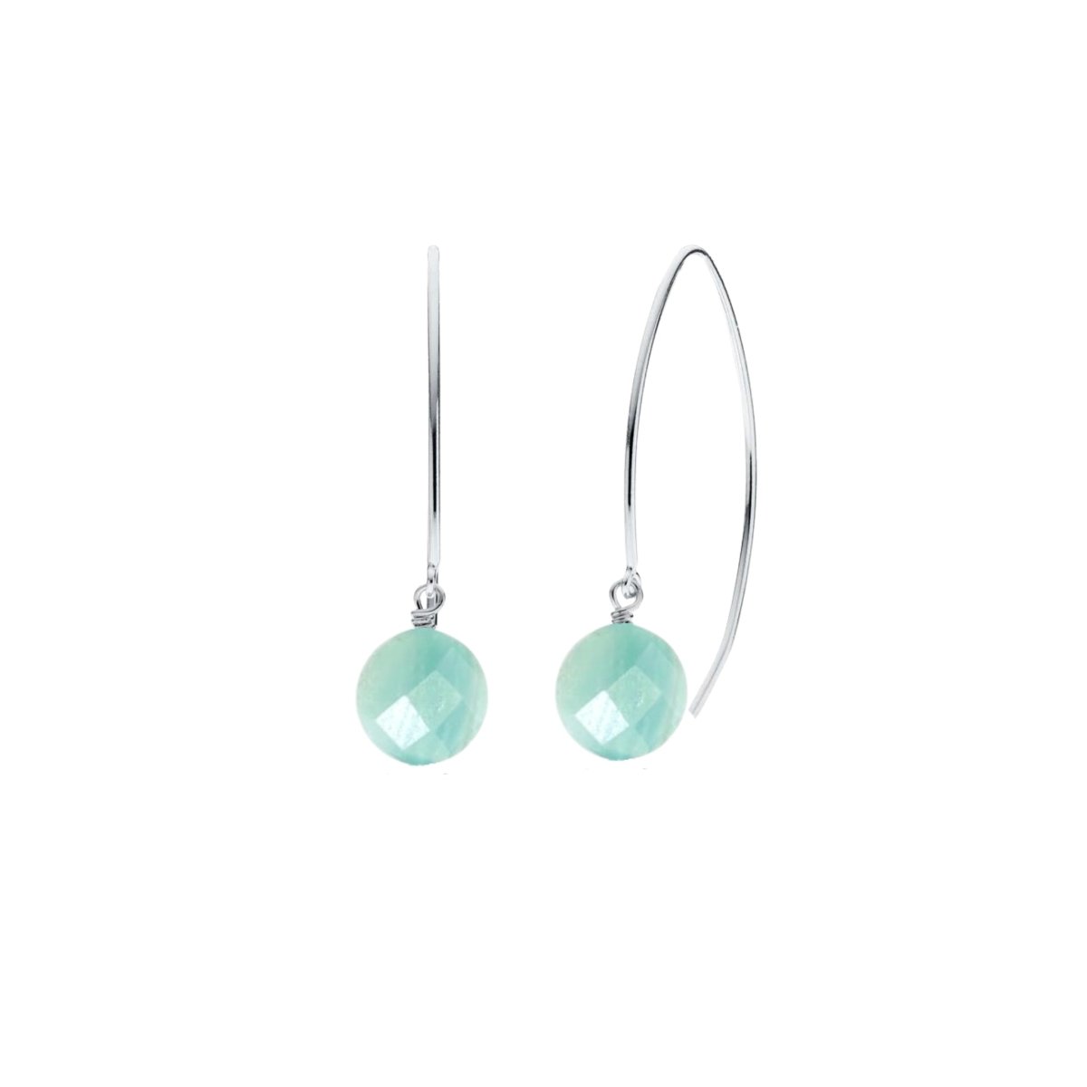 Faceted amazonite coin stones hang from sleek sterling silver wishbone-style ear wires for a modern, effortless look. Each pair offers soft, ocean-inspired color with a subtle shimmer and gentle movement. Finished with a lightweight feel and approximately a 1½ inch drop — perfect for everyday wear, gifting, and adding a touch of calm coastal color to any outfit.