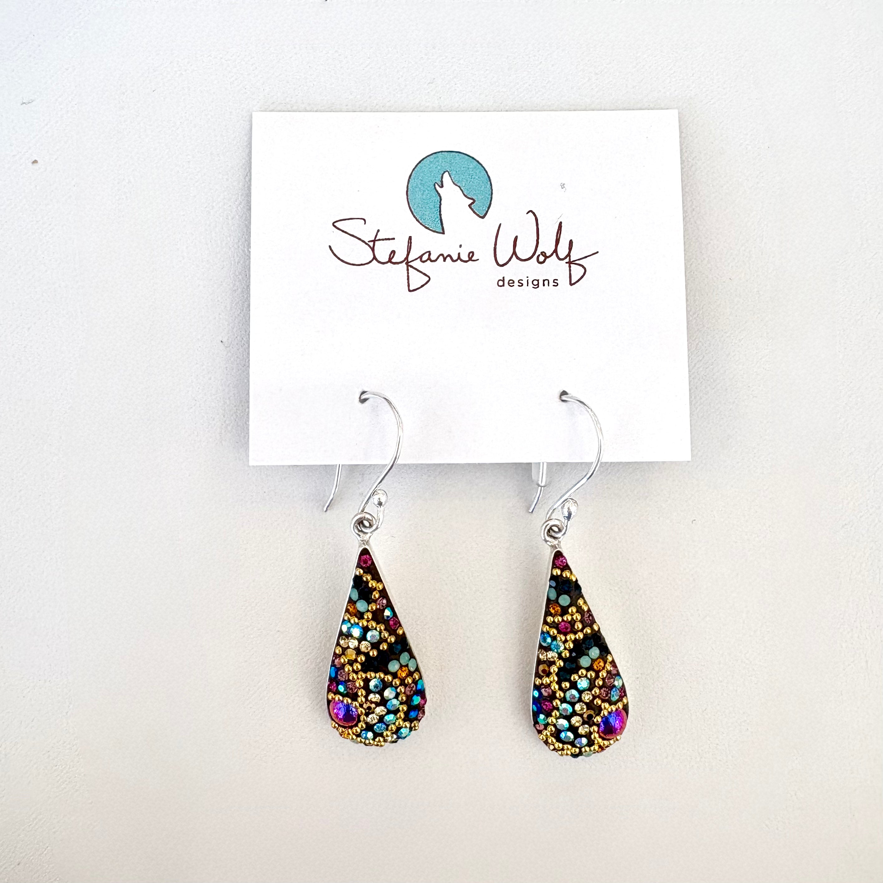 Choose from various patterns of concentric circles and rainbow stripes. Each earring features intricate patterns of hand-set Austrian crystals wrapped in sterling silver. This incredible mosaic design includes tiny treasures of crystals in varying sizes, accented with dichroic glass.