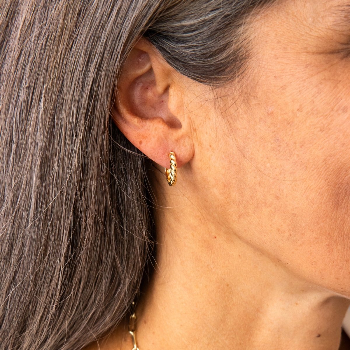 Our Twisted Rope Hoop Earrings add a touch of texture and timeless style to any look. These petite huggie hoops are designed to hug your earlobes comfortably with a secure hinged closure at the base—perfect for everyday wear.
