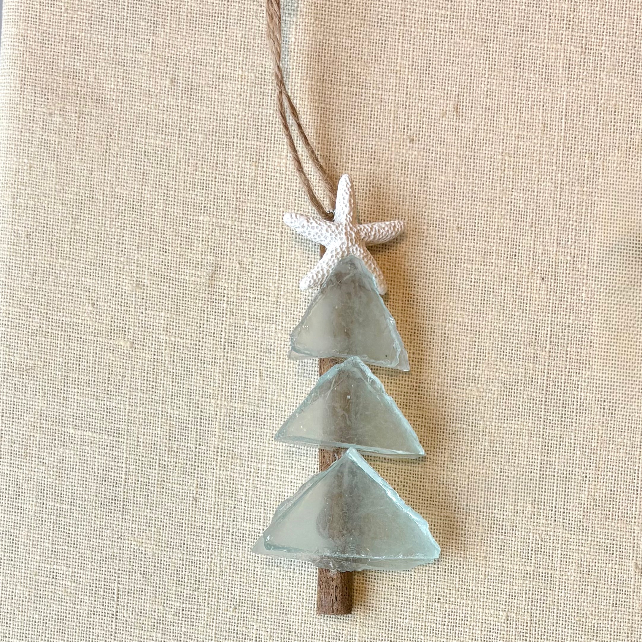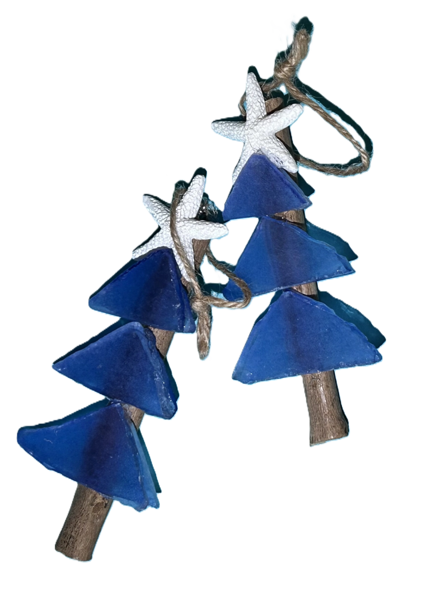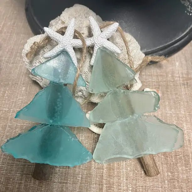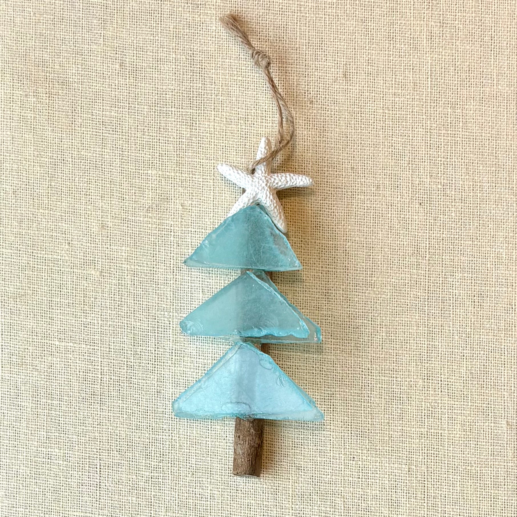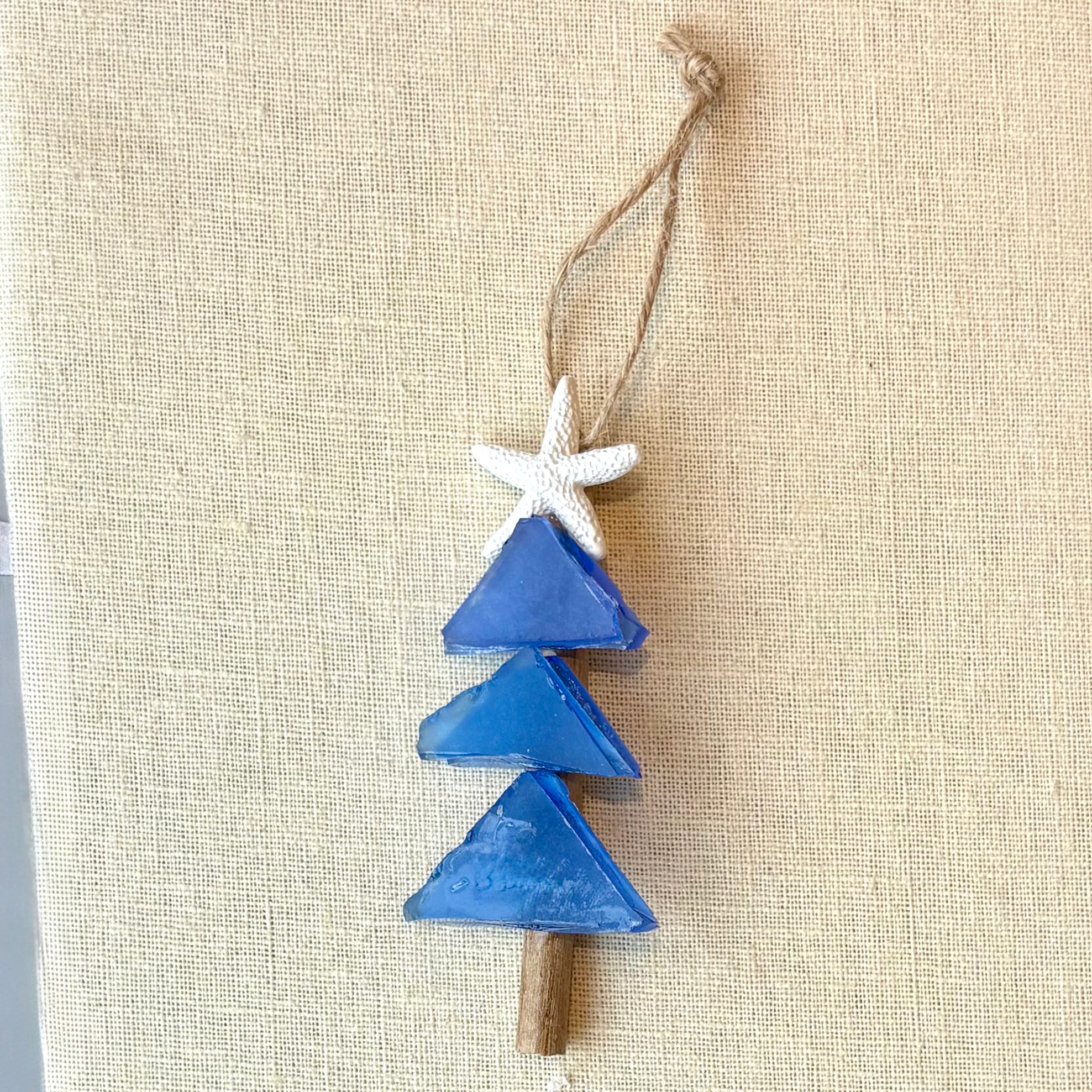 A delicate and enchanting sea glass ornament hanging from your Christmas tree. This ornament features pieces of seaglass in shades of teal, seafoam, and white, meticulously arranged on a slender wooden stick. The seaglass glistens like frozen droplets of the ocean, capturing the light and adding a touch of coastal elegance to your holiday decor. At the top of the ornament, a resin starfish sits proudly, its intricate details and translucent finish adding a magical touch. The starfish's arms extend gracefully, creating a natural, organic look that complements the seaglass perfectly. This charming ornament is finished with a rustic twine loop, making it easy to hang on your tree. It brings the beauty of the beach into your home, reminding you of the gentle waves and sandy shores, even in the midst of winter.