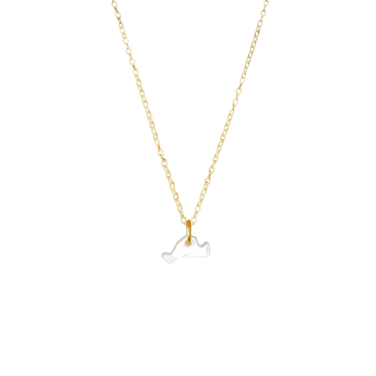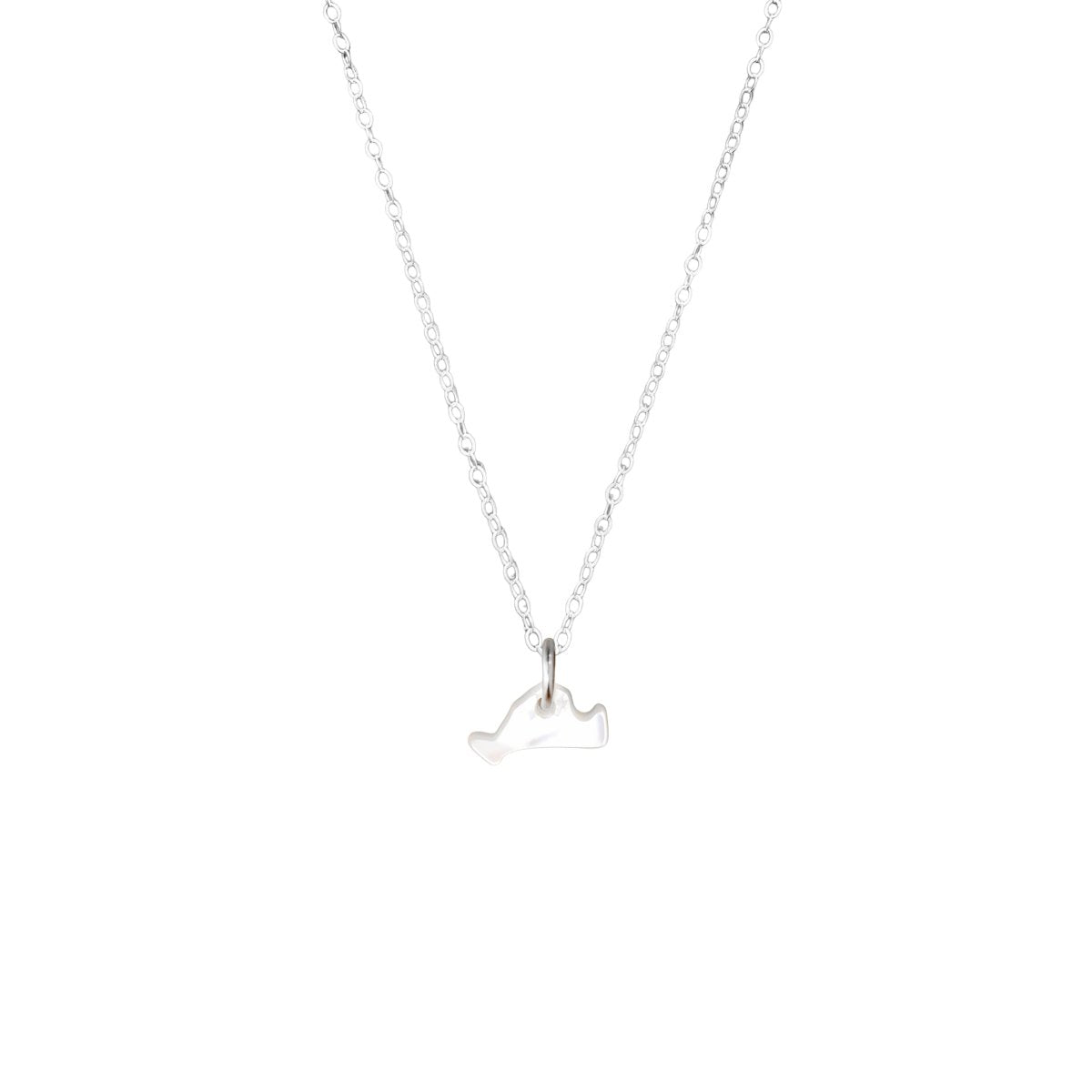 Celebrate your love for the island with this petite keepsake. A tiny but luminous piece of mother of pearl is delicately carved into the shape of Martha’s Vineyard and floats on an 16-18" simple cable chain. The iridescent shell shimmers softly, adding a touch of coastal magic to your everyday look.