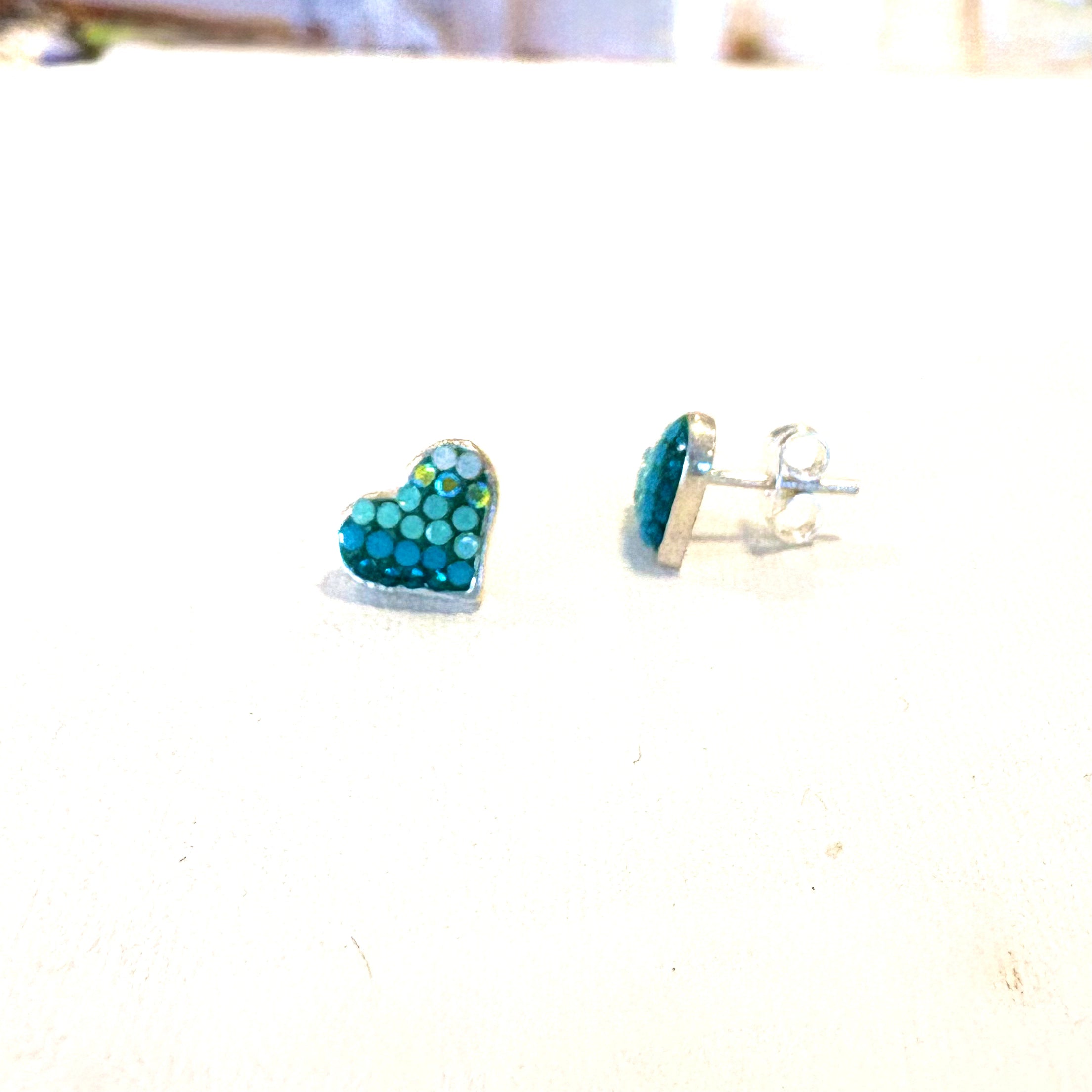 Our Capri Mosaic Heart Stud Earrings are crafted in .925 sterling silver and feature a vibrant palette of teal, green, turquoise, aqua, and blue accents. Bright and expressive, they bring a joyful pop of color with a classic heart-shaped silhouette.