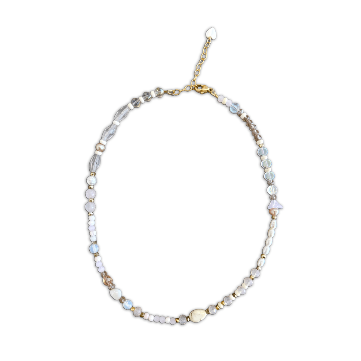 With its gentle palette of blush pink and champagne tones, this necklace feels like a breath of fresh air. It layers beautifully or stands on its own as a quiet statement of care, softness, and intention.