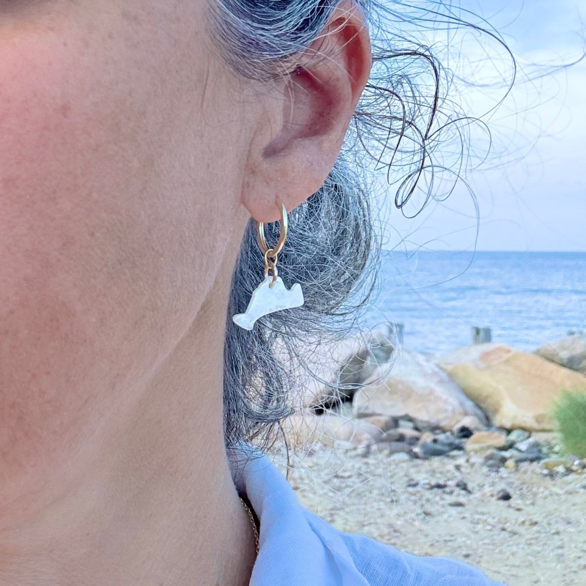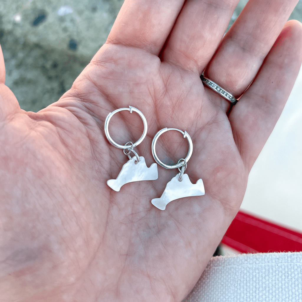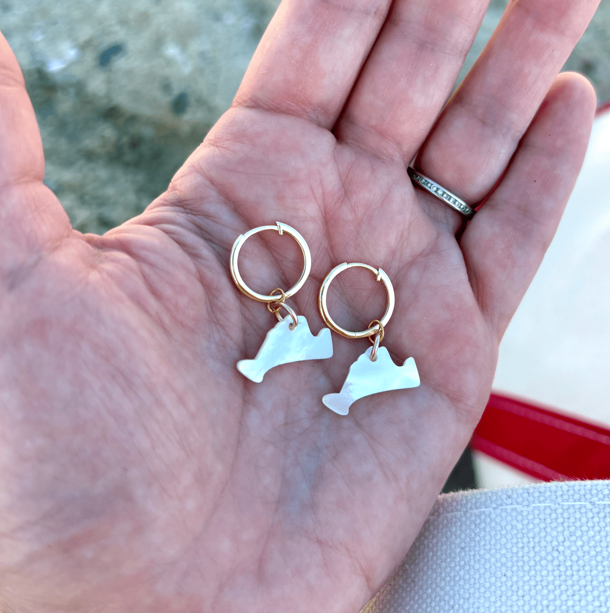 Our Martha’s Vineyard Hoop Earrings pair a classic, go-with-everything silhouette with a little island magic. Each hoop features a hand-carved mother-of-pearl charm in the shape of Martha’s Vineyard, adding a soft shimmer and a meaningful touch.