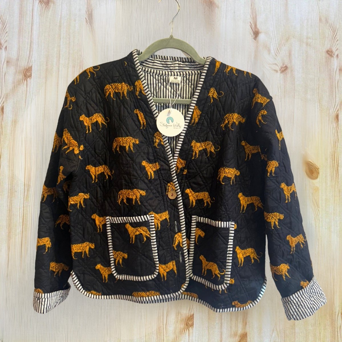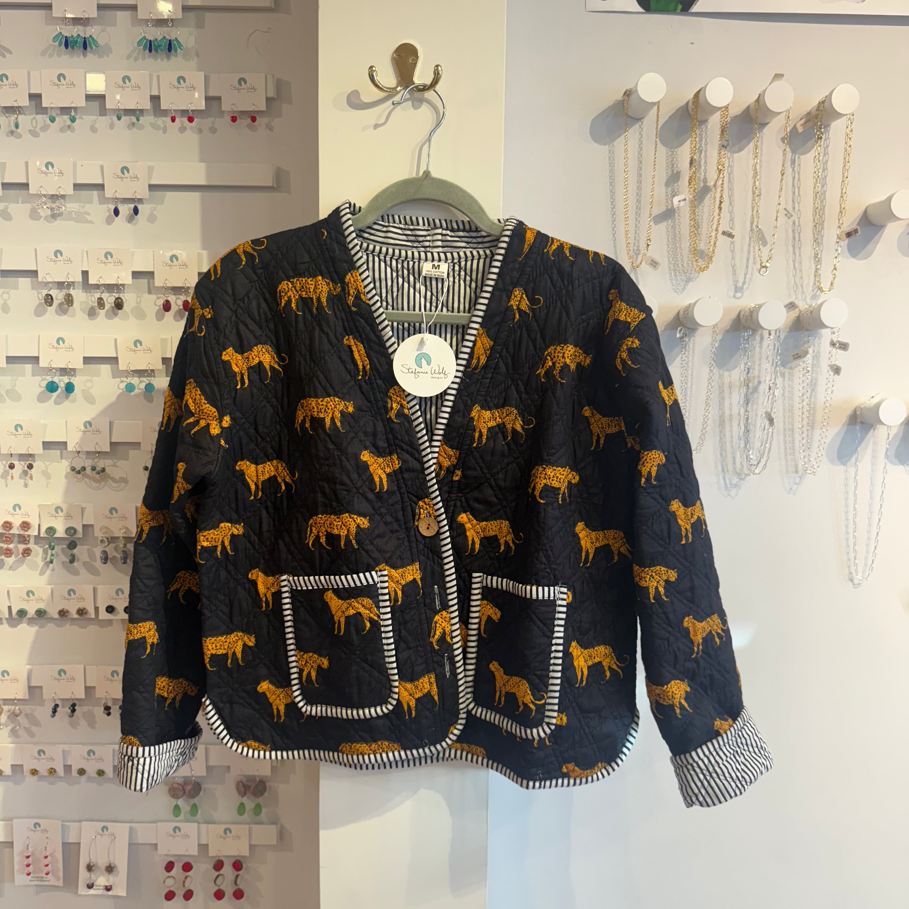 Black Block Printed Cheetah Reversible Handmade Quilted Jacket