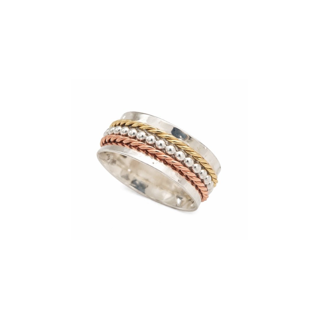 This sterling silver spinner ring features 3 different tones of copper, silver, & gold. Its versatility can't be beat! With its buttery inside, this spinner ring is comfortable for everyday wear.