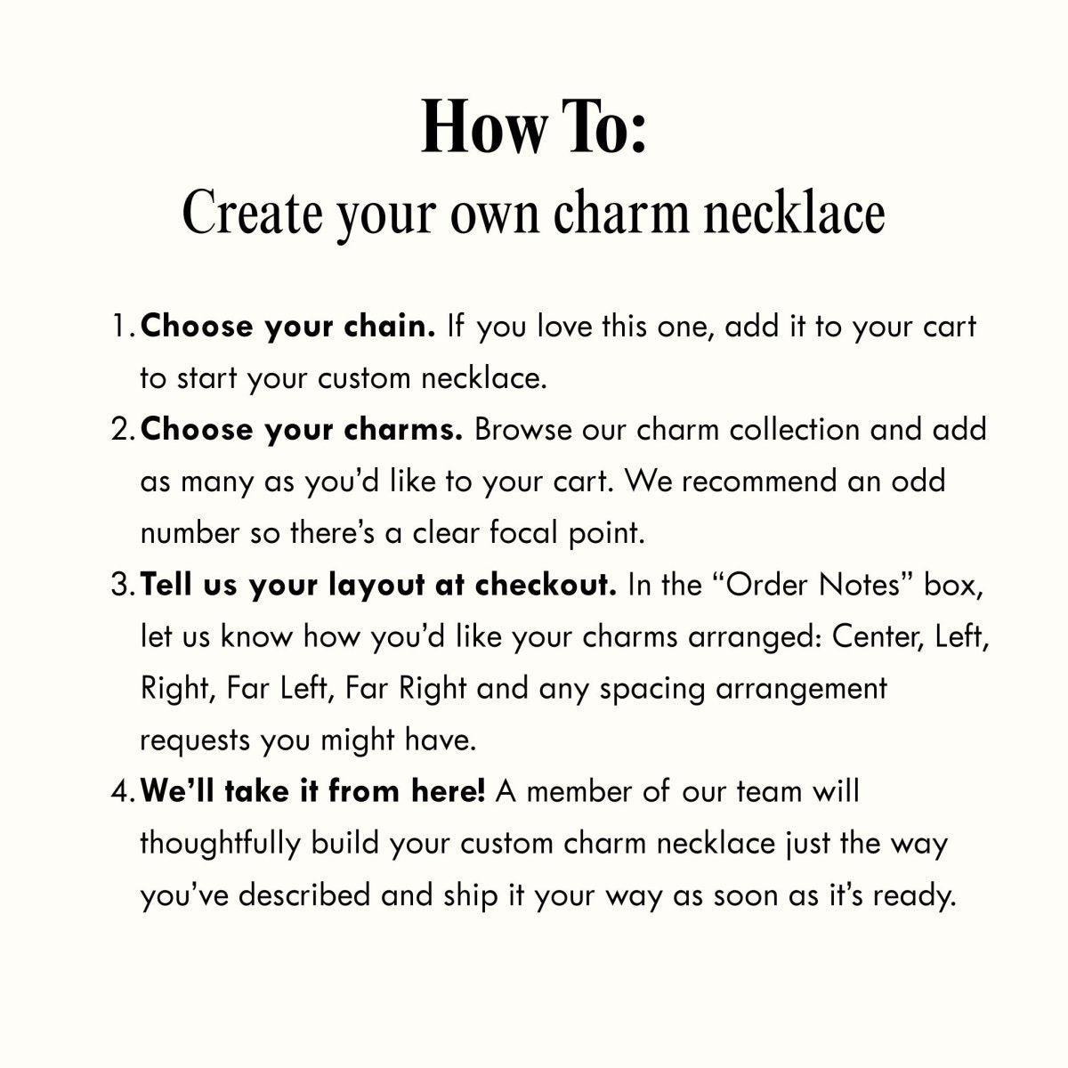 - We’ll take it from here A member of our team will thoughtfully build your custom charm necklace just the way you’ve described and ship it out as soon as it’s ready.