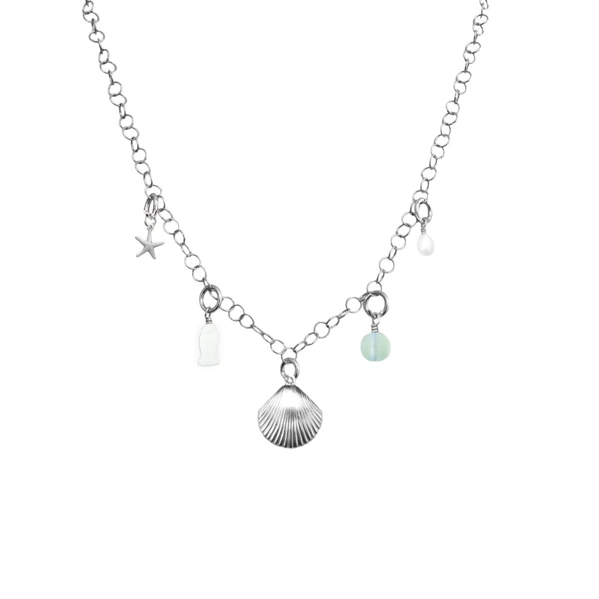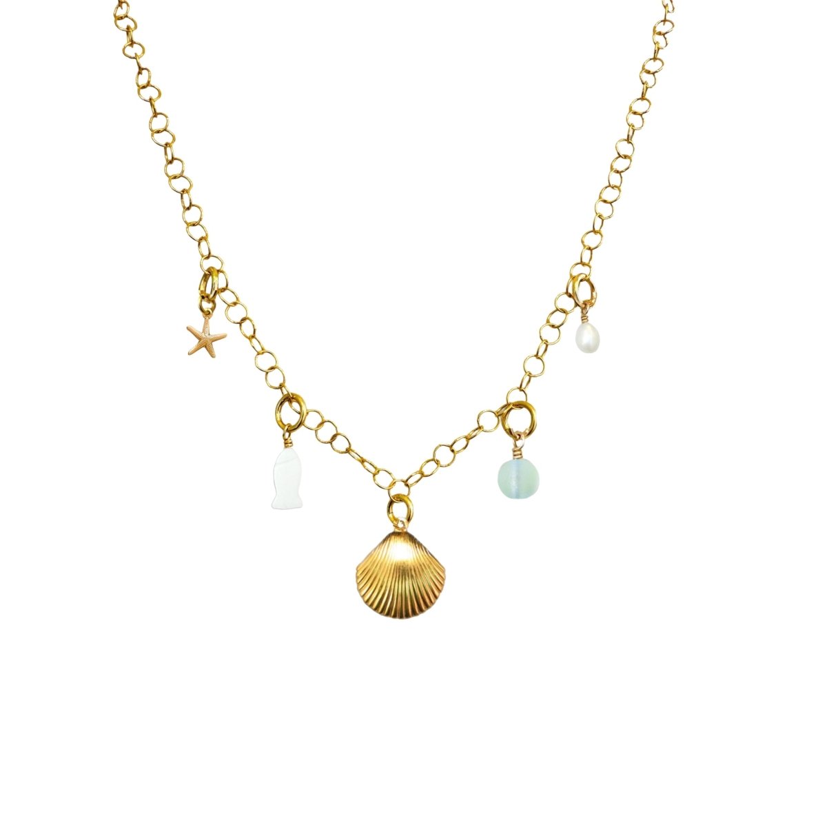 Handmade in our studio, this ocean-inspired charm necklace brings together some of our best-loved treasures of the season. A medium-sized scallop shell pendant takes center stage, joined by a tiny freshwater pearl, a delicate starfish, and a glowing seaglass ball. Each sea glass charm is shaped by the ocean and carries the spirit of summer days spent by the shore, making this necklace a timeless coastal keepsake.